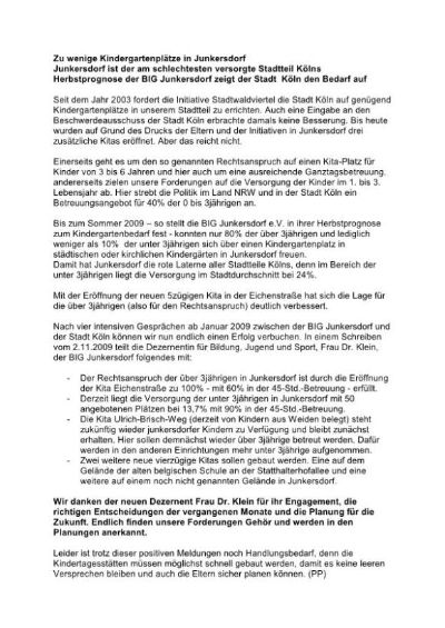 Weiterer vierzügiger Kindergarten an der Statthalterhofallee. Sobald das Gelände durch die Stadt Köln erworben ist, soll unverzüglich der Bau einer weiteren vierzügigen Kindertagesstätte eingeleitet werden. Junkerdorf hat aktuell die schlechteste Kita-Versorgung aller Stadtteile in Köln. Wenn am 1.8.2009 die neue fünfzügige Kita an der Eichenstraße eröffnet wird, verbessert sich die desolate Versorgungssituation spürbar, aber die unter dreijährigen Kinder sind in Junkersdorf immer noch nur zu 10% versorgt, während in Köln durchschnittlich 23% der Kinder einen Platz erhalten und die Stadtverwaltung eine 40%ige Versorgung für alle unter Dreijährigen anstrebt. Der Neubau des neuen 4-zügigen Kindergartens wird dann auch für die Kleinsten und deren Eltern in Junkersdorf eine große Entlastung bedeuten.
