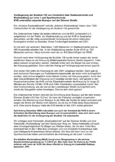 Die KVB hat an Herrn Jochen Ott (SPD) bezüglich der Verlängerung der Bus-Linie 136 einen abschlägigen Brief geschrieben. Argumente: Trotz Kreuzungausbau am Militärring und Verbreiterung der Dürener Str. bleibt der Stau, eine Verlängerung der Linie 136 ist unwirtschaftlich, die Verkehrsanbindung mit dem 143er-Bus ist ausreichend. Das Stadtwaldviertel orientiert sich fälschlicherweise nach Lindenthal (Innenstadt) statt richtigerweise nach Weiden (Rheincenter). Von den Transportbedürfnissen der Schüler und der Älteren kein Wort. Der Arbeitskreis will aber weiter am Ball bleiben: Politiker nicht aus der Verantwortung lassen, ein provisorische Wartehäuschen von unseren Kindern gebaut soll öffentliche Aufmerksamkeit erzeugen. Mit dem Heranwachsen der Kinder werden immer mehr Kinder in die Grundschulen nach Lindenthal und in der weiterführenden Schulen in Lindenthal fahren. Über kurz oder lang werden das weit über 100 Schüler aus unserem Viertel sein.