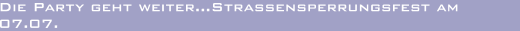 Wir feiern diesen Freitag (7.7.), ab 19.00 Uhr zwischen den Pfosten. Das ist der sicherste Platz im Viertel und außerdem kann man so den wendenden Autofahrern zuwinken.