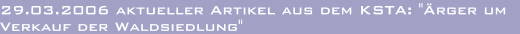 Ein Artikel über das leidige Thema mit dem Verkauf der Waldsiedlung, wer, warum und welche Interessen verfolgt werden, wird auch in diesem Artikel nicht eindeutig klar. Mit Sicherheit ist aber eine Menge Geld im Spiel, und Klüngelei gibt es nicht nur auf kölscher Ebene. Hier der Link zum nachlesen: http://www.ksta.de/html/artikel/1143027863674.shtml