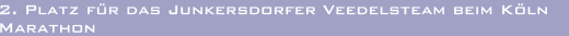Das Team hat nach etlichen persönlichen Beschwerden im Vorfeld und dem sportlichen Ausfall des vermeintlich stärksten Läufers einen hervorragenden zweiten Platz unter Einsatz aller verfügbaren Kräfte errungen. Geschlagen geben musste sich unsere Mannschaft nicht von Lindenthal, nein nur von Höhenberg, die mit dem Top Ultraläufer Jochen Kümpel schon mal eine 2:41...stehen hatten, somit konnten die zwei anderen Wertungsläufer etwas langsamer laufen. Erwähnt sei aber noch kurz, das sie auch sehr gute Zeiten mit 3.09.. und 3:31.. gelaufen sind.